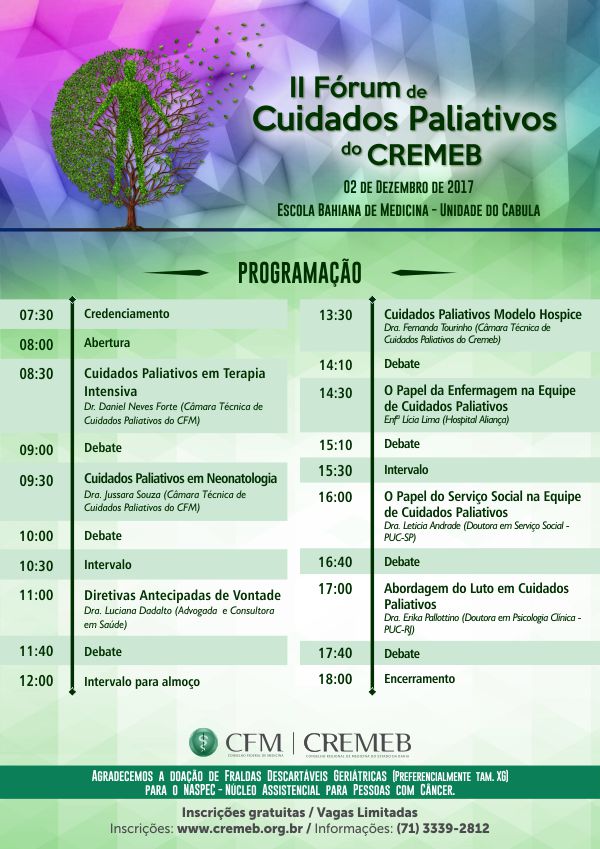 Neste contexto, o Conselho Regional de Medicina do Estado da Bahia promoveu o II Fórum de Cuidados Paliativos do Cremeb, no dia 02/12/2017 (sábado), no auditório da Escola Bahiana de Medicina e Saúde Pública (Unidade Cabula).