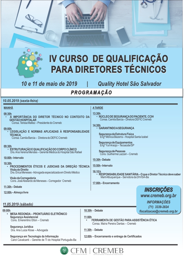 O IV Curso de Qualificação para Diretores Técnicos do Conselho Regional de Medicina do Estado da Bahia (Cremeb) aconteceu nos dias 10 e 11 de maio (sexta-feira e sábado), no Quality Hotel São Salvador (Stiep). O evento foi gratuito e teve como objetivo capacitar Diretores Técnicos e gestores médicos para o desempenho da função de chefia médica.