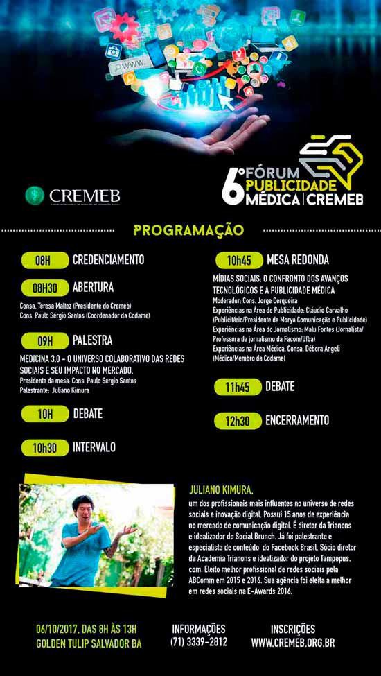 Neste ano, a Comissão de Divulgação de Assuntos Médicos do Cremeb (Codame), responsável pela iniciativa, convidou um time de especialistas em redes sociais para explorar os temas. Com 15 anos de experiência em Comunicação Digital e ex-colaborador do Facebook Brasil, Juliano Kimura é um dos nomes garantidos para palestrar no Fórum, abordando “O Universo Colaborativo das Redes Sociais e Seu Impacto no Mercado”. Já a mesa redonda terá o publicitário e empresário Cláudio Carvalho, compartilhando suas experiências na área; a jornalista e professora de jornalismo Malu Fontes, explanando a sua visão sobre o uso das novas mídias; e a conselheira do Cremeb Débora Angeli, que irá completar a gama de saberes com o seu conhecimento na área médica.