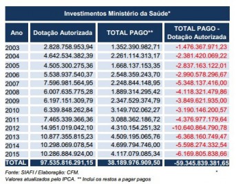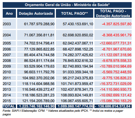 Vale lembrar que o Ministério da Saúde já iniciou o ano de 2016 com um déficit de pelo menos R$ 2,5 bilhões em seu orçamento. Segundo a Lei Orçamentária Anual (LOA) sancionada em janeiro, a pasta conta com a previsão de R$ 118, 5 bilhões – cifra 2% menor que a estabelecida no ano passado (R$ 121 bilhões). Pelo extrato das contas do Ministério, conforme tem revelado frequentemente o Conselho Federal de Medicina (CFM), acredita-se que, até dezembro, novos cortes e contingenciamentos comprometam ainda mais o financiamento do Sistema Único de Saúde (SUS).