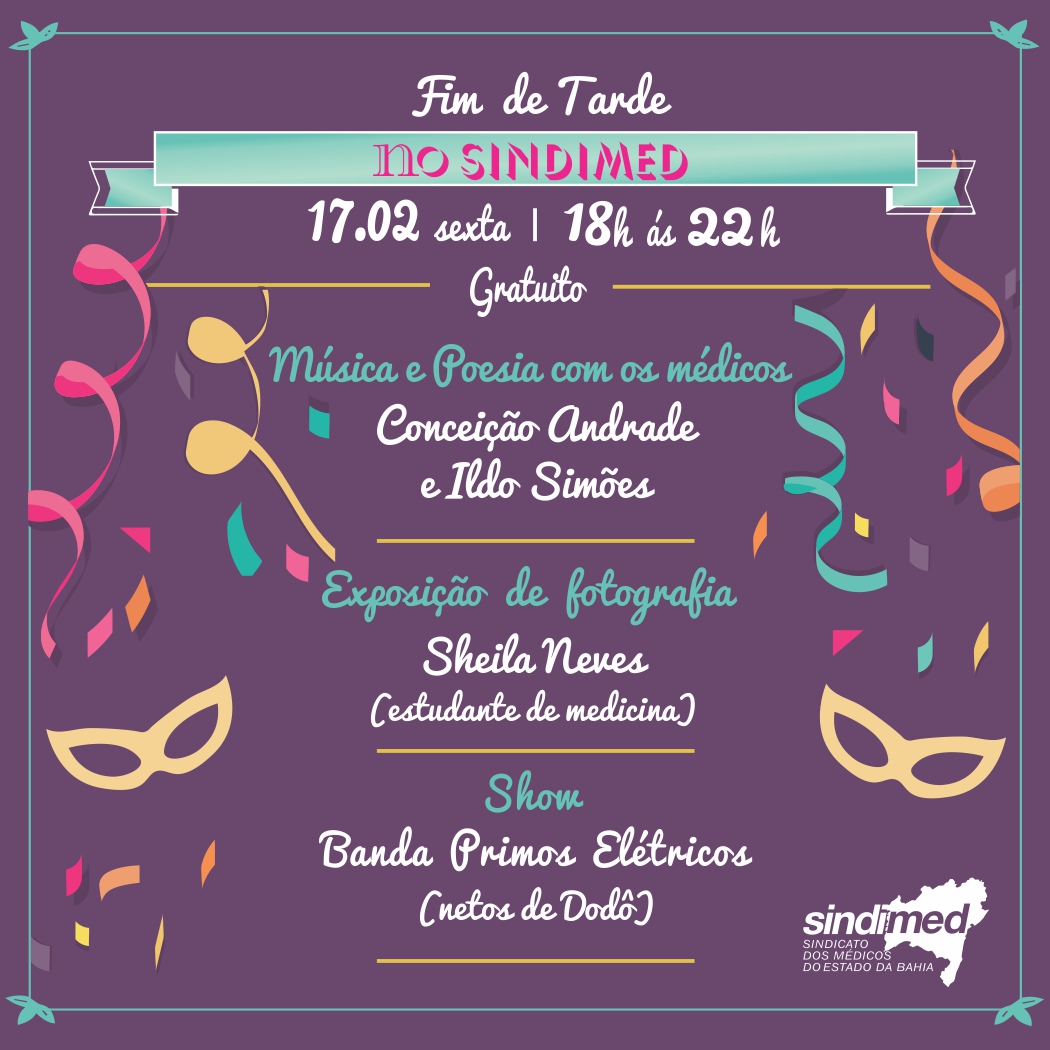 Em clima de carnaval, o Sindicado dos Médicos do Estado da Bahia (Sindimed) vai realizar a 6ª edição do projeto Fim de Tarde no Sindimed, iniciativa que tem o objetivo de propor um ambiente lúdico através da cultura e da arte. A sede do órgão vai se tornar um grande baile carnavalesco, dia 17 de fevereiro (sexta-feira), a partir das 18h, ao som da banda Primos Elétricos, formada pelos netos de Dodô, da famosa dupla Dodô e Osmar, os inventores do trio elétrico.