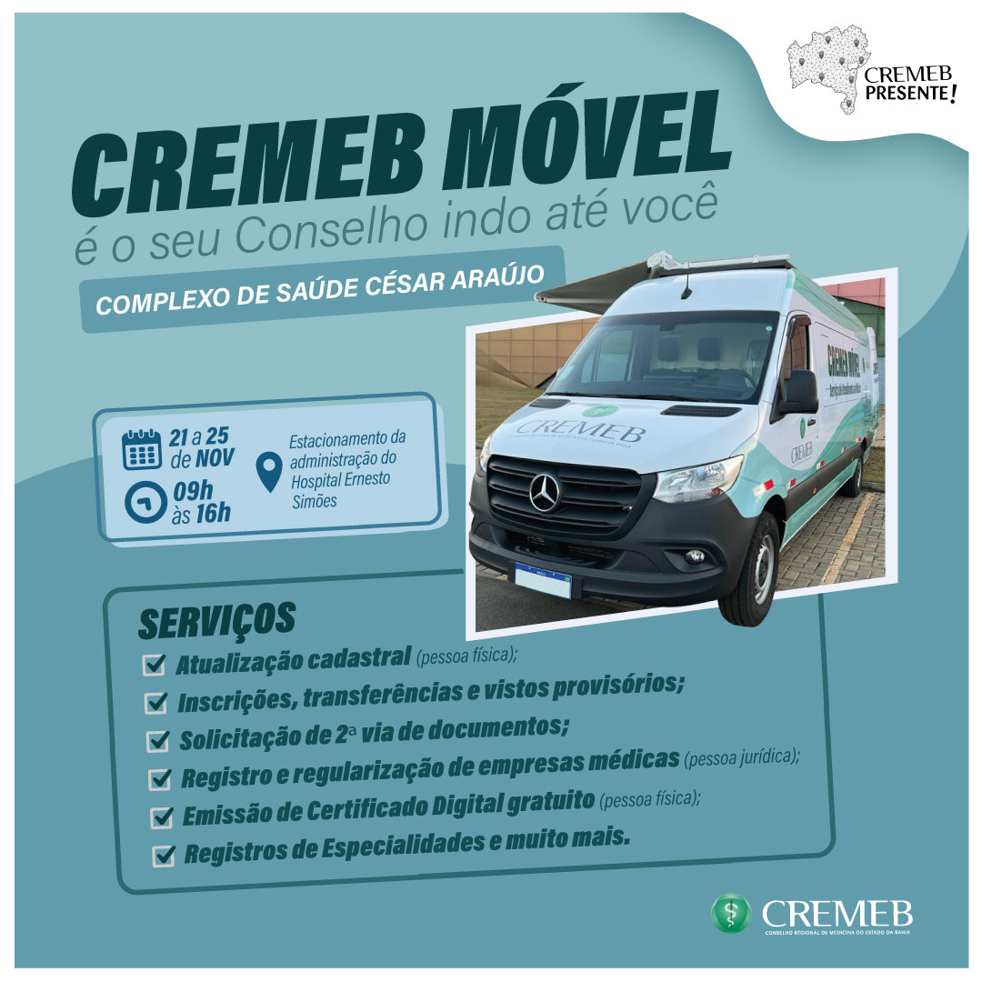 Proporcionando comodidade ao levar os serviços do Conselho Regional de Medicina do Estado da Bahia até os postos de trabalho da classe médica baiana, o Cremeb Móvel já tem data e local para iniciar as suas primeiras atividades: de 21 a 25 de novembro, no Complexo de Saúde César Araújo. De segunda à sexta-feira, a classe médica que atua em alguma das cinco instituições que compõe o complexo, terá à sua disposição os mesmos serviços disponíveis na sede do Conselho, das 9h às 16h (exceto no dia 24, que funcionará das 9h às 13h, por conta do jogo do Brasil), no estacionamento da administração do Hospital Ernesto Simões. Dentre os principais serviços prestados na unidade móvel do Cremeb, destacam-se a emissão do Certificado Digital do CFM (gratuito), atualização cadastral, registro de especialidade (RQE) e regularização de Pessoa Jurídica.