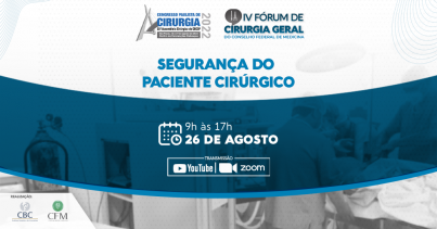 No dia 26 de agosto, o Conselho Federal de Medicina (CFM) realizará o IV Fórum de Cirurgia Geral, que terá como tema principal a Segurança do Paciente Cirúrgico. Realizado por videoconferência na plataforma Zoom e com transmissão pelo YouTube, o evento receberá especialistas compartilhando, por exemplo, a experiência da Unicamp (do HC/UNICAMP), da USP (do HC/FMUSP) e do serviço privado de saúde na implantação da Cirurgia Segura, além das dificuldades enfrentadas pelo serviço público, a formação médica e implicações éticas neste protocolo.