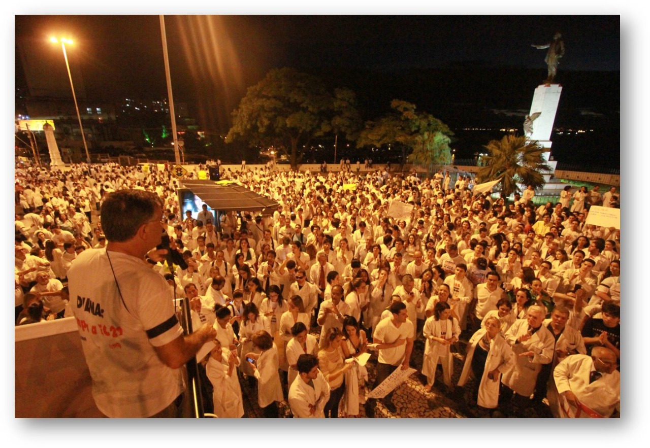 - No canto inferior direito, Dr. Almério Machado, ao lado do conselheiro decano Jorge Cerqueira, nas manifestações em defesa da Medicina, em 2013